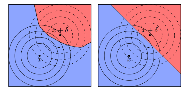 برای تخمین زدن احتمالهای دو کلاس محتمل میتوان از روشهای monte carlo و نمونهبرداری استفاده کرد. در عمل اضافهکردن نویز و آموزشدادن مدلها با نویز، یک روش موثر برای ساختن مدلهای robust نسبت به حملهها به شبکههای عصبی هستند. (کافی است را از روی دلخواه بسازید و به صورت اثبات پذیر می دانیم مقاوم است)