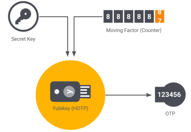 همچنین، به ازای هر کاربر، در سرور و سیستم کاربر یک شمارنده وجود دارد که با هر بار تولید OTP، این شمارنده یک عدد افزایش مییابد. نحوۀ کارکرد این الگوریتم به این صورت است که اپلیکیشن سمت کلاینت و سرور، با استفاده از شمارنده (C) و کد مخفی (K) یک هش SHA تولید میکند و آن را به یک تابع Truncate میسپارد. تابع Truncate نیز بر اساس قرارداد، شش یا پنج رقم آخر آن را به عنوان OTP شناسایی کرده و بازمیگرداند. همچنین، با هر درخواست، شمارنده (C) یک عدد افزایش مییابد.