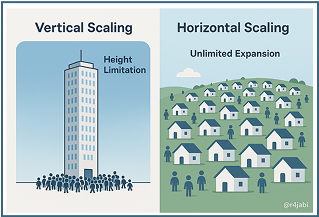 مقیاسپذیری عمودی به معنای تقویت یک سیستم واحد از طریق افزودن منابع سختافزاری مانند حافظهRAM و پردازندهCPU است -مانند اینکه یک آسمانخراش بسازیم و هر زمان که نیاز داشتیم، یک طبقه به آن اضافه کنیم. این روش در ابتدا منطقی بهنظر میرسد، اما با افزایش تعداد کاربران به محدودیتهایی برمیخوریم. زیرا هر سیستم تنها تا اندازهٔ مشخصی میتواند منابع بیشتری دریافت کند و افزودن این منابع معمولاً با هزینههایی تصاعدی همراه است.
