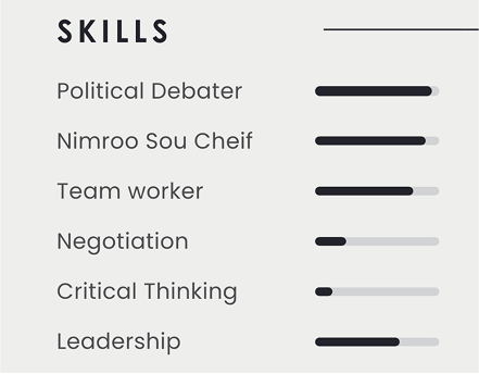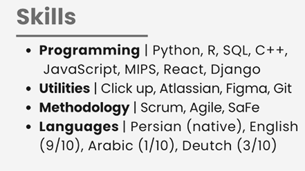 در این بخش به بیان تیتروار تواناییهای خود بپردازید. این موارد شامل زبانها و فریمورکهای برنامهنویسی (مانند پایتون، C و…)، ابزارهای خاص (فرضاً Jira ،Figma و…)، روشهای مدیریت پروژه (Scrum ،Agile و…) و زبانهای گفتاری (فرضاً انگلیسی، آلمانی و…) است. لازم نیست توانایی خودتان در زمینۀ پخت نیمرو، مهارت بینقصتان در بحثهای سیاسی با اقوام و یا قدرت بالای خود در کار تیمی را در این بخش بیاورید، چرا که اهمیتی برای خواننده نداشته و به وی کمکی در راستای تصمیمگیری نمیکند. مشکل متداول بعدی در این بخش، استفاده از گرافیک برای نشان دادن میزان تسلط است. این مورد علاوهبر اینکه توسط سیستمهای بررسی رزومه، پشتیبانی نمیشود، بلکه تمرکز را از نقاط قوت اصلی شما دور میکند. امکان بیراه رفتن در این بخش بسیار بالاست، پس مستقیم و سرراست تواناییهای خود را بگویید و وارد بخش بعد شوید.