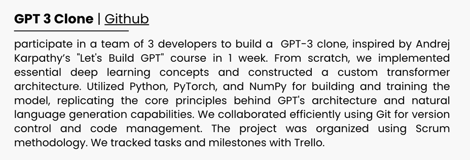 بهطور معمول، مهمترین بخش رزومۀ یک فرد، تجربیات پیشین او در موقعیتهای شغلی مشابه است. در صورتی که این بخش وجود نداشته باشد (فرضی که این متن بر اساس آن آغاز شد)، پروژههای او به کلیدیترین بخش تبدیل میشوند. لازم است تا پیش از اقدام برای موقعیت شغلی مربوطه، تعداد قابلتوجهی پروژۀ مرتبط را پیادهسازی کنید تا جای خالیِ نداشتن تجربه را پر نمایید. اولین مسیر برای پیادهسازی این پروژهها، درسهای پروژهمحور یا دارای تمرینهای حجیم در دانشکده است. علاوهبر درس «برنامهنویسی پیشرفته» (که احتمالاً یکی از چالشبرانگیزترین پروژههای دوران تحصیل شما خواهد بود)، دروسی مانند مبانی برنامهنویسی، الگوریتم و موارد مشابه، دارای پروژهها و تمرینهای گستردهای هستند که گنجاندن آنها در رزومه برای شما سودمند خواهد بود. مسیر دوم و کاربردیتر، پروژههای موجود در سطح اینترنت هستند. شما میتوانید این پروژهها را در یوتیوب، وبسایتهای معتبر و سایر منابع بیابید. کافی است نام زبان یا فریمورک برنامهنویسی موردنظر خود را به همراه کلیدواژۀ «Project» (طبیعتاً به انگلیسی) جستوجو کنید تا با انبوهی از ویدیوها روبهرو شوید که نهتنها چارچوب یک پروژه را با آن زبان یا فریمورک تعریف میکنند، بلکه کد کامل پروژه را نیز بهصورت زنده نوشته و در اختیار شما قرار میدهند. بهترین راه برای یادگیری عمیق مفاهیم برنامهنویسی و تقویت رزومه، استفادۀ صحیح از این ویدیوهاست. توصیه میکنم ابتدا چارچوب و پروژۀ تعریفشده در این ویدیوها را درک کنید و سپس، یک بار بدون کمک ویدیو، اقدام به پیادهسازی آن نمایید. پس از آن، در مرحلۀ دوم، گامبهگام همراه ویدیو پیش بروید و کد پروژه را دوباره بنویسید. مستقل از مسیر انتخاب شده، کدهای پروژهها را در حساب گیتهاب خود قرار دهید. در رزومه، ابتدا نام پروژه را ذکر کرده و لینک مربوط به آن در گیتهاب را در کنار نام درج کنید. سپس، در حد یک پاراگراف، به توضیح مواردی چون ابزارها و فناوریهای بهکاررفته، مفاهیم کلیدی پیادهسازیشده، اعضای تیم (در صورت انجام کار گروهی)، مدت زمان اجرای پروژه و همچنین ارجاع به منبع الهامبخش (در صورت تمایل) بپردازید. بهشدت توصیه میکنم این بخش را جدی بگیرید و حداقل ۴ پروژه، شامل ۲ پروژهٔ دانشگاهی و ۲ پروژهٔ موجود در اینترنت را در رزومهٔ خود قرار دهید.