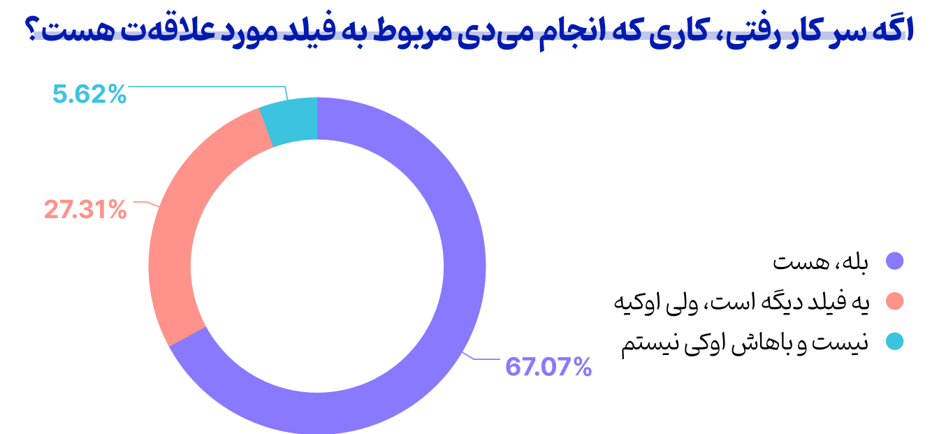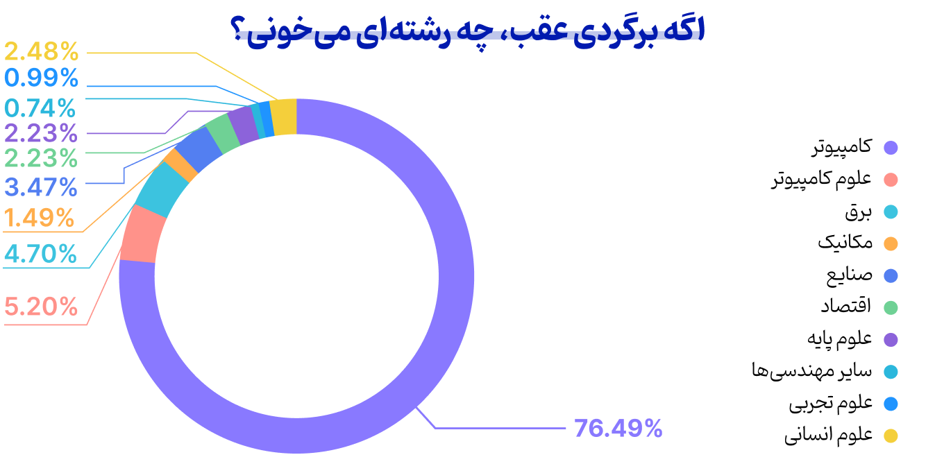 در گام نخست، میزان رضایت دانشجویان از انتخاب رشتهٔ خود را بررسی کردیم. نتایج نشان میدهند که 80 درصد از دانشجویان اگر به عقب برگردند، باز هم حوزهٔ کامپیوتر را انتخاب میکنند؛ آماری که بار دیگر این باور را تأیید میکند که دانشجویان کامپیوتر بیش از بسیاری از رشتههای دیگر از انتخاب خود خشنودند و آمار بهنسبت کم دورشتهایها و ماینورها نیز میتواند نمودی از جامعیت این رشته باشد.