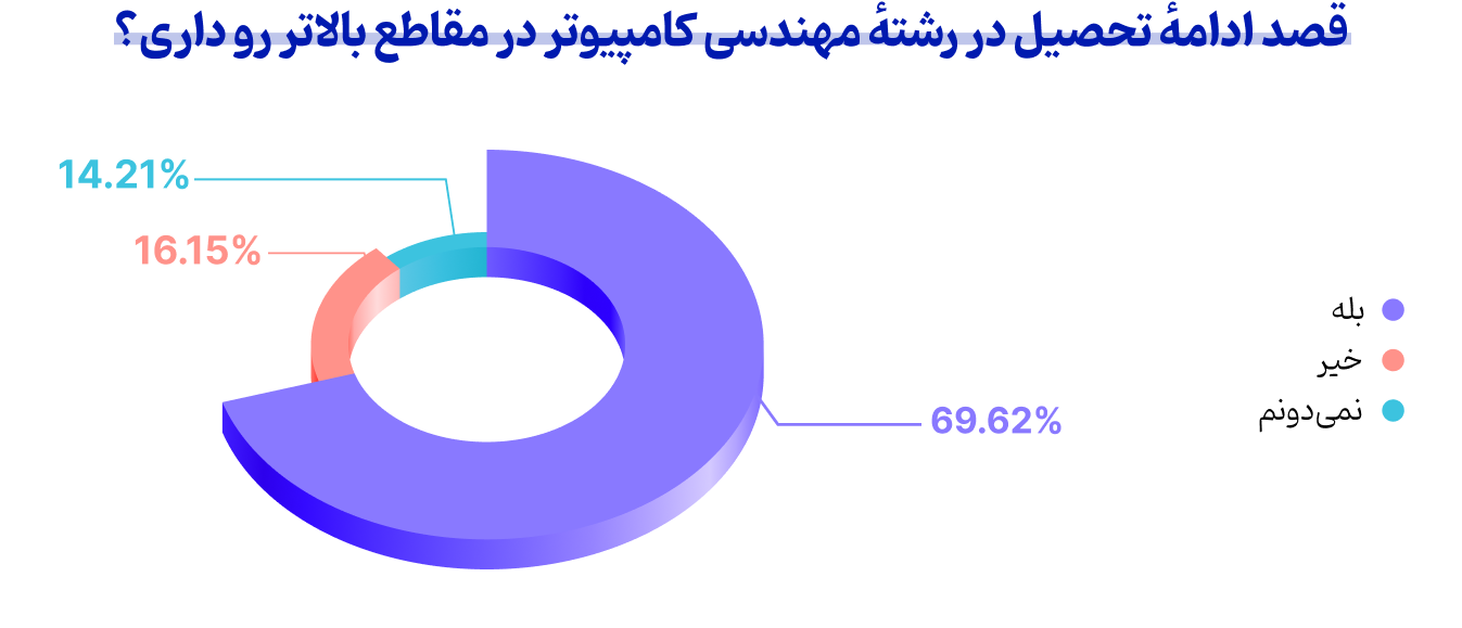 جالبتر اینکه درصد قابلتوجهی از همین دانشجویان قصد دارند در همین رشته ادامهٔ تحصیل دهند. این موضوع نشان میدهد حتی کسانی که شاید در آینده مسیر خود را تغییر دهند، همچنان معتقدند که مهندسی کامپیوتر انتخاب اشتباهی نبوده؛ بلکه برعکس، مسیری بوده که دید و جهت تازهای به آنها دادهاست.