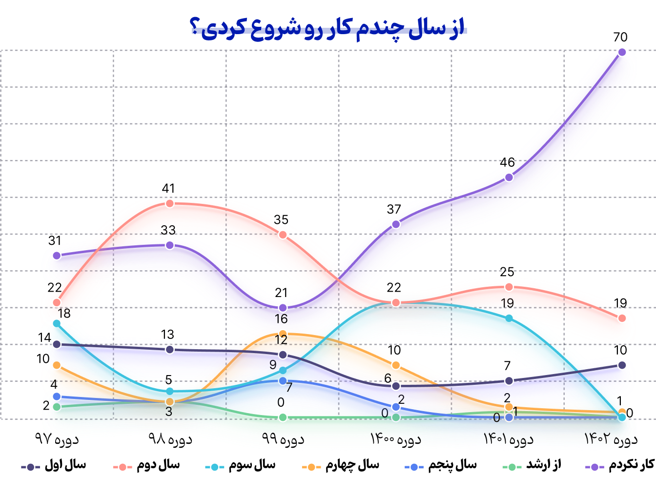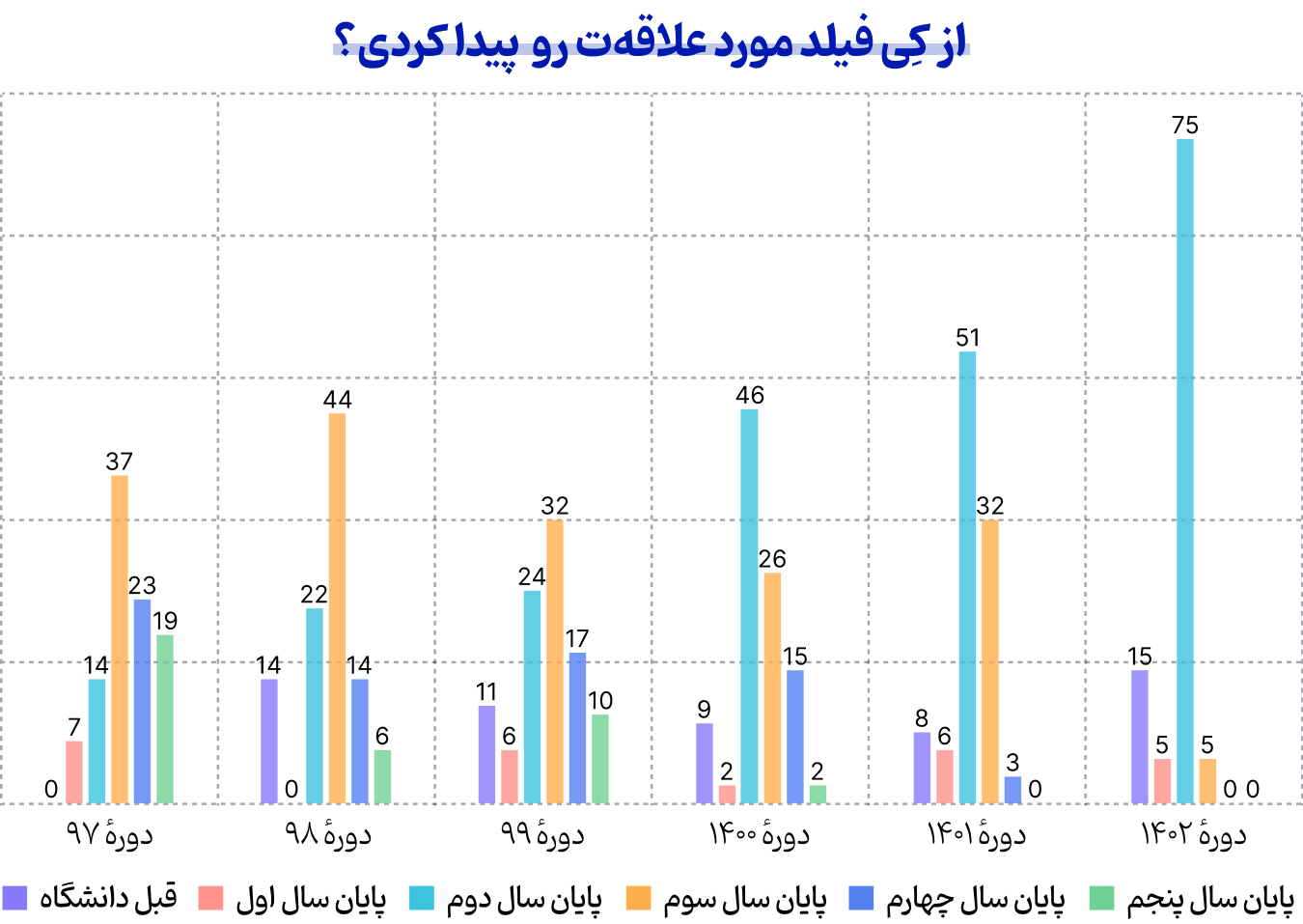 اکثر دانشجویان در سالهای میانی علایق خود را پیدا کردهاند که میتواند نشان دهد تجربیات عملی و دروس میانی نقش پررنگی در شکلگیری علاقه دارند و از طرفی در دورههای جدیدتر، افراد علاقهٔ خود را زودتر پیدا کردهاند که باز هم میتواند تحتتأثیر ترندهای روز این حوزه باشد.