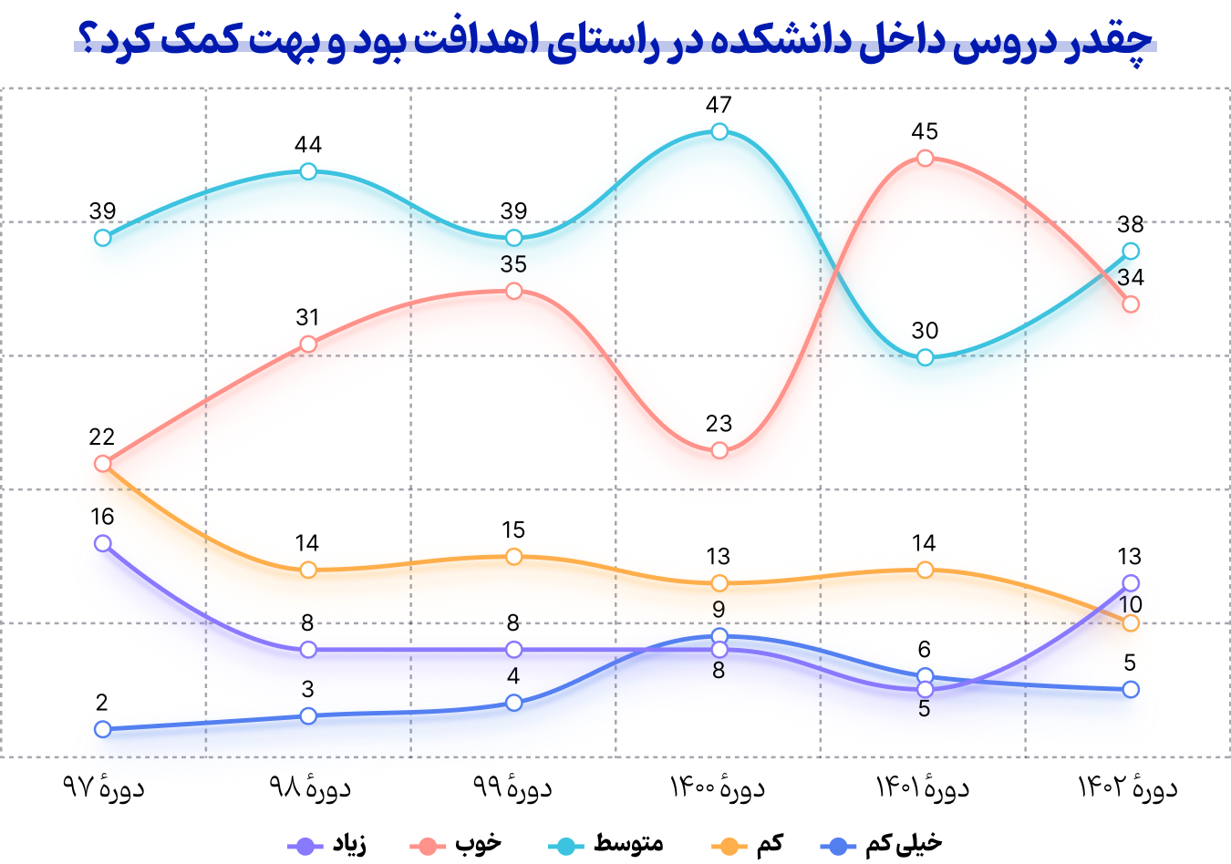 رضایت بالاتر دورههای کمجمعیتتر از دروس دانشکده نیز نمودی دیگر از چالش بزرگ دانشکده، یعنی کمبود درس و استاد است. افزایش تعداد ورودی بدون ایجاد زیرساخت، بازدهی مفید را تا حدی کاهش داده، اما رضایت نسبی و مشابه از دروس در دورههای مختلف نشان میدهد وجود تیای ها تا حدی توانسته خلأهای آموزشی دانشکده را پر کند.